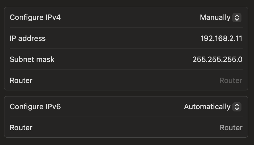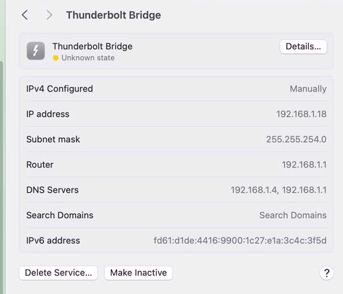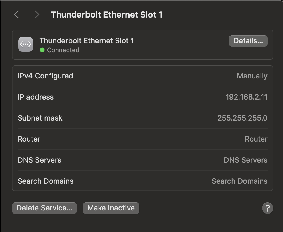 Thanks Bob. Currently I am connected via 10G and I can’t disconnect at the moment. Right now when I ping 192.168.2.3 it does come back with 64 bytes over and over. System Settings > Network > Thunderbolt Ethernet Slot 1 the IP address is configured manually to 192.168.2.11.