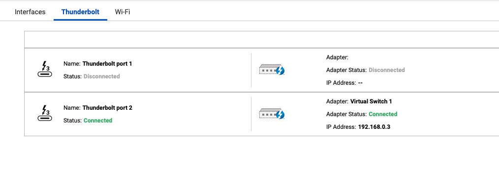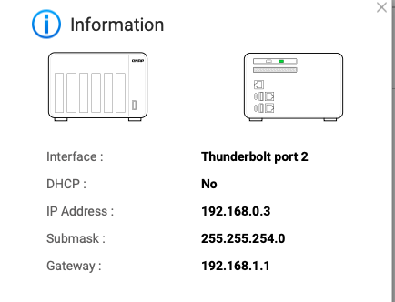 Thanks very much for the screenshots and taking the time to respond. When I set up the NAS I recall having trouble with direct Thunderbolt. People on this forum told me I was wasting my time and must buy the adapter and connect via 10G for a reliable connection. I was disappointed at the time because I did not want to spend more money on the adapter when I had already purchased the Thunderbolt card. But the Thunderbolt connection was not working, so I had not choice. I purchased th adapter and set it up as instructed, and it initially worked fine, but now it’s no longer connecting reliably.