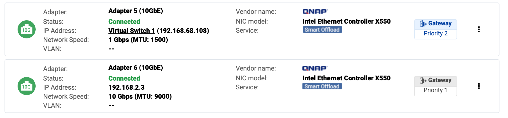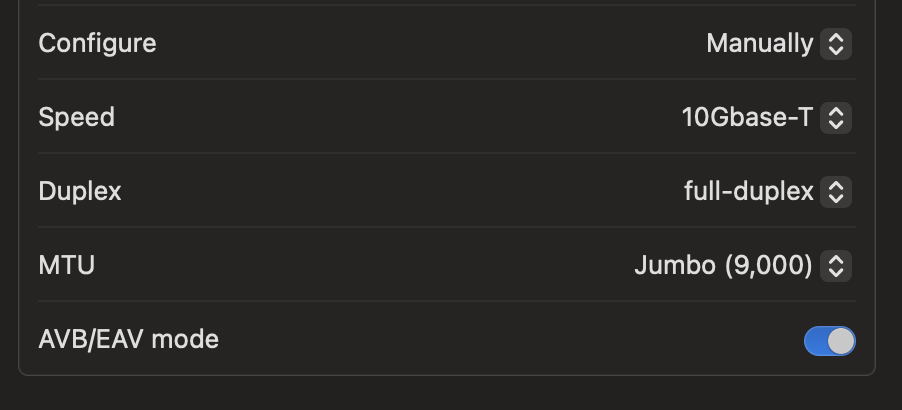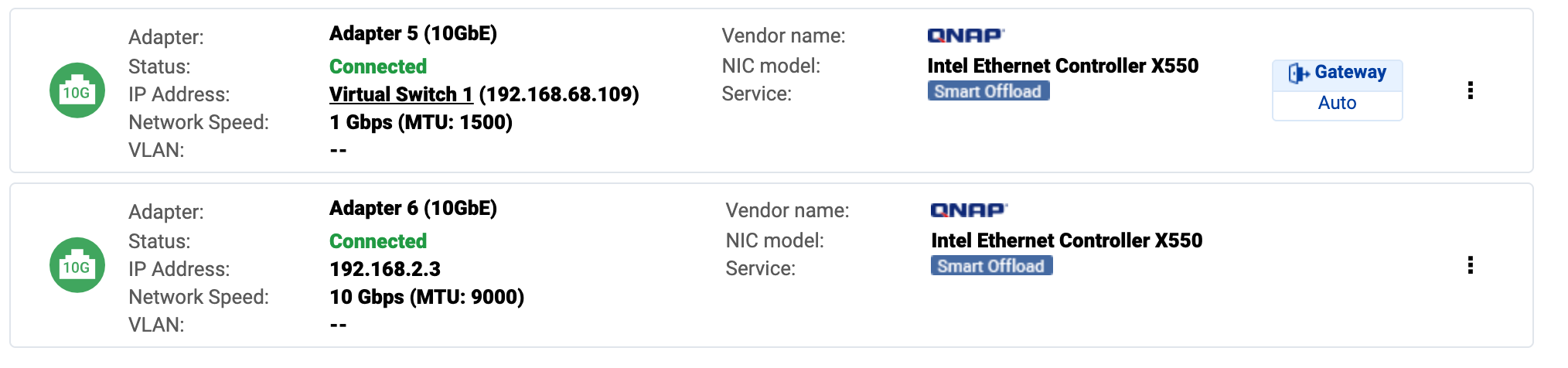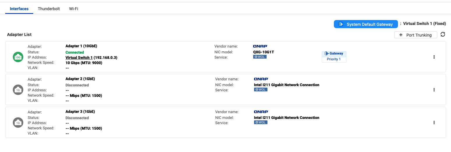 I have a TVS-h1288X running QUTS hero h5.2.6.3195 connected to a Macbook pro running Mac OS 15.5 via a Qnap T310G adapter. On the mac, the thunderbolt ethernet is configured manually for IPv4 and automatically for IPv6. When I check the network settings on the NAS I see 2 connected 10GbE adapters: one running at 1 Gbps and the other at 10 Gbps.