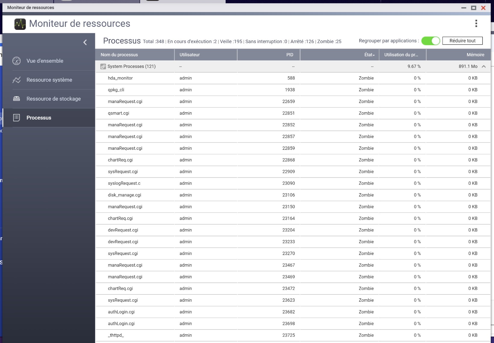 I would say open a ticket with QNAP and have them check why all these processes are there (none of my NAS have that many, mostly up to a dozen at a time), but make sure you switch your UI from french to English when submitting screenshots, to either the forum or to a ticket)