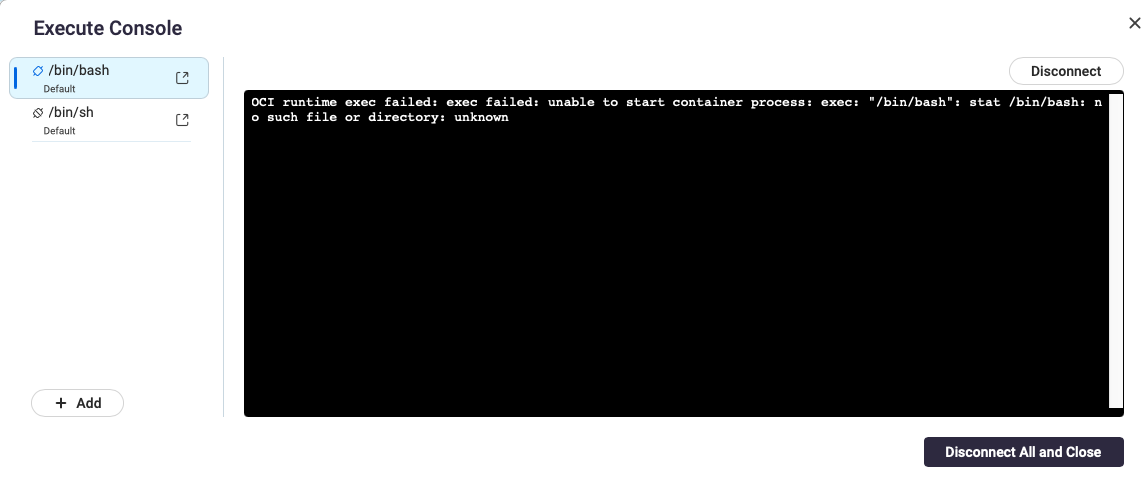 Here’s the issue: to execute a command inside the container, the command must EXIST inside the container image. If your image doesn’t HAVE a shell, there’s nothing for you to exec.