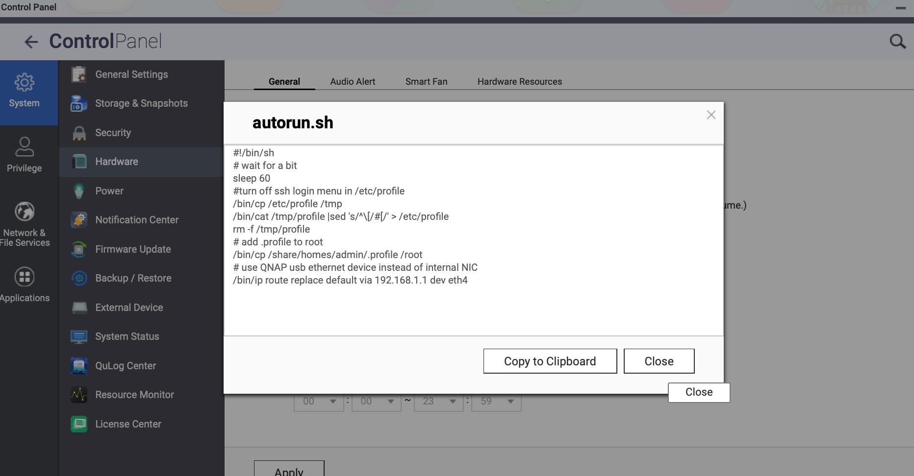 I still need the autoexec to run after each boot to set my network routing up. For some reason, the QNAP won’t automatically route thru the USB ethernet, even though it is the only NIC attached to the box. That leaves it only talking my class c here at the house. I can’t figure out why it won’t run.