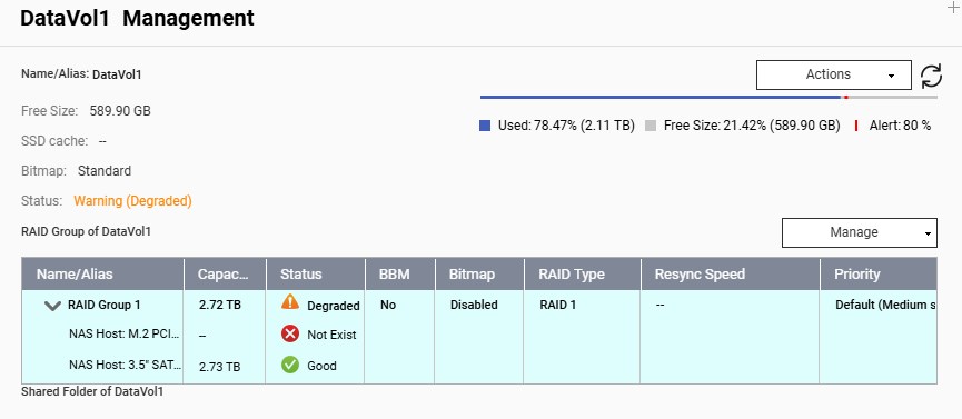 Except that on inserting the second drive, it complained of degraded RAID Group, although both hard drives are (individually) in good condition.