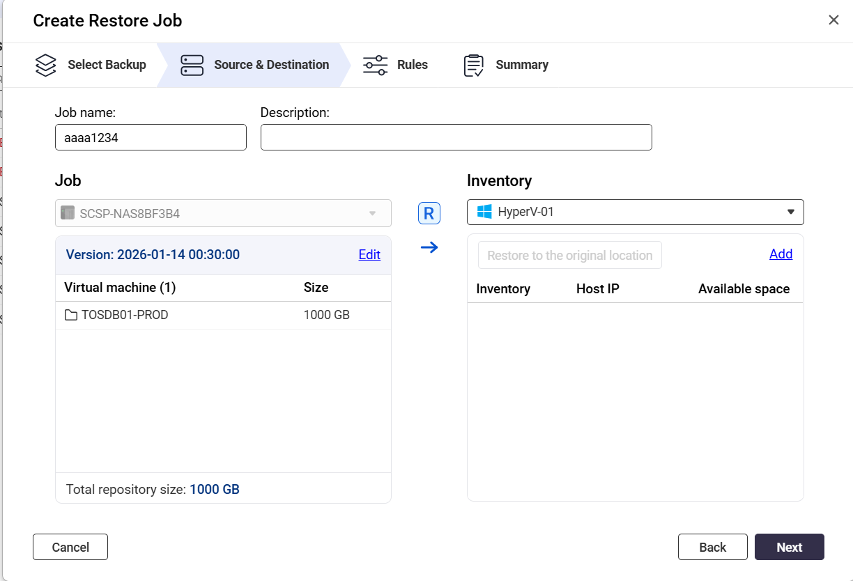 I’m using TS-673A, FW: 5.28, HDP 2.3.2 and Agen 1.3.1 one VM is not able to restore. After pick VM from backup to restore on the Left side then the right side is not list destination folder so it is not allow to move next step. Tried to change destination server result are same