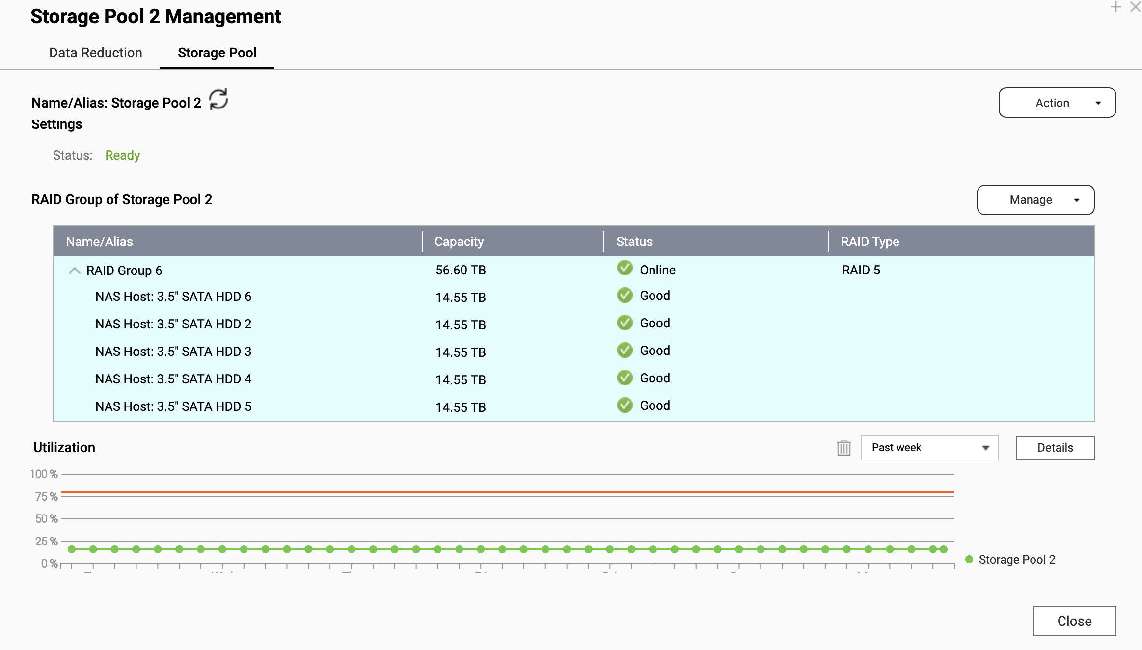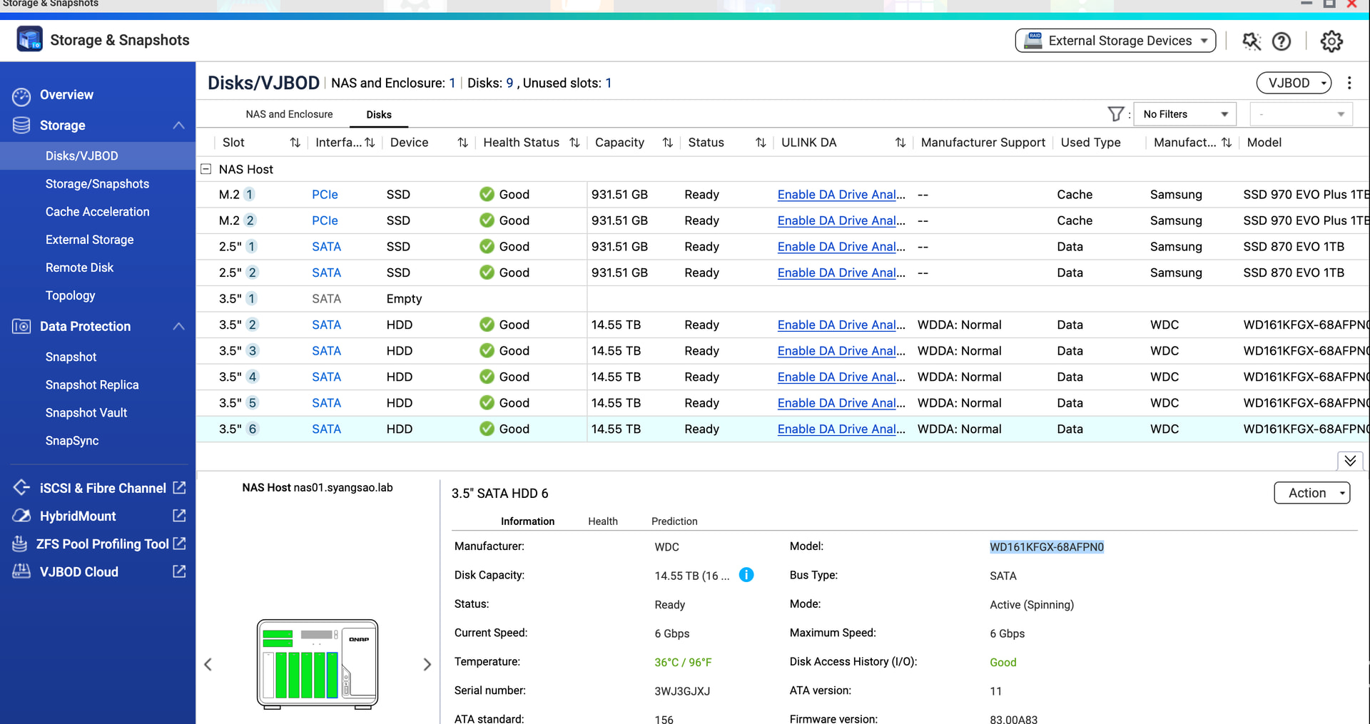 Disk 1 recently failed, and my hot spare in disk 6 tookover - rebuild took about 10 days, everything shows green.