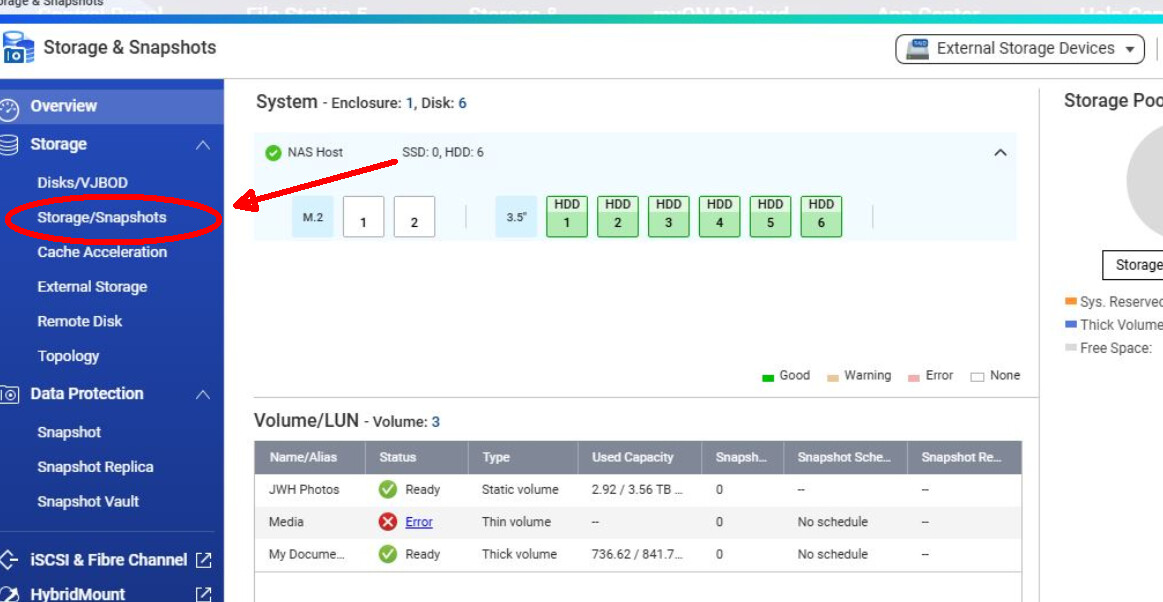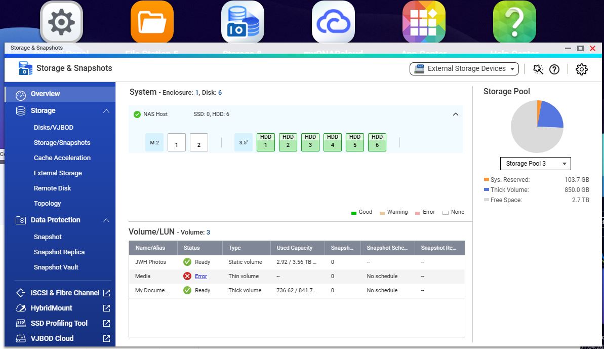 TS-664(fw 5.2.9.3410)で、最近ドライブの1台が予告なく故障しました。幸いにも、それはThin Volumeで、RAIDの一部ではなく、内容もバックアップされていて簡単に利用できます。他の5台のドライブは、2台がRaid1、1台がスタティックボリューム、1台がシックボリュームとなっており、ほとんどのデータはバックアップされていますが、すぐにはアクセスできません(つまり、整理が十分ではありません)。理想的には、故障したドライブと同じ6TBのドライブに交換し、できるだけ早くNasを再稼働させたいと考えています(つまり、データを失わずに済ませたいです。体調が悪く、4月末まで復元作業に時間を割けません)。どなたかご助力いただけると大変ありがたいです。