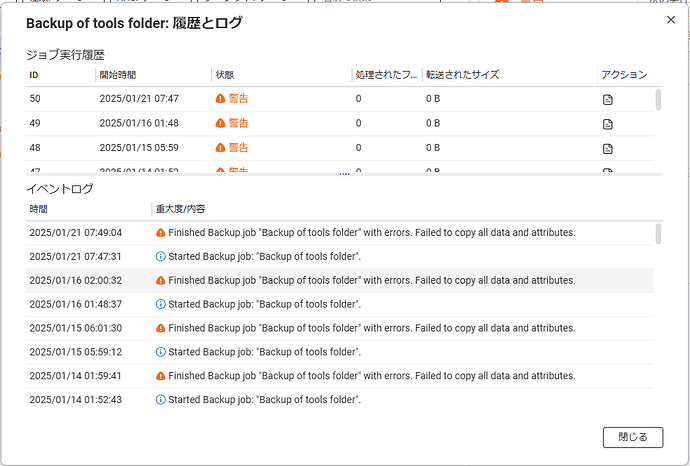Finally, there is one warning left, but checking the job details shows that it’s a backup to RDX (USB-Disk),