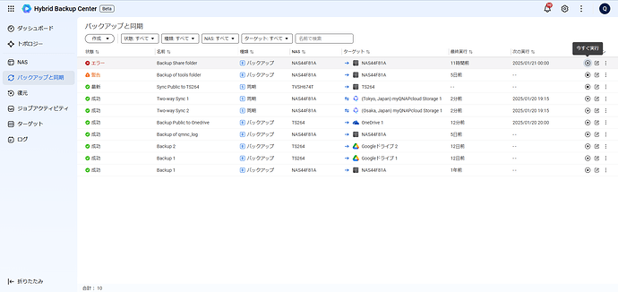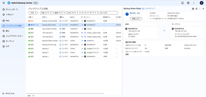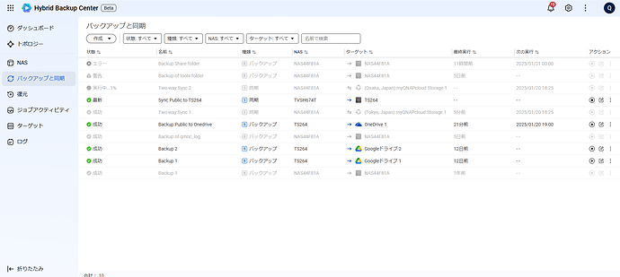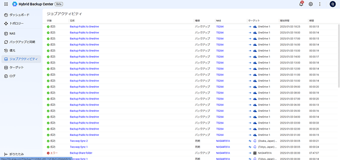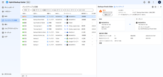 You can display a list of backup jobs across multiple NAS devices and check the status of each backup job. It looks like this: