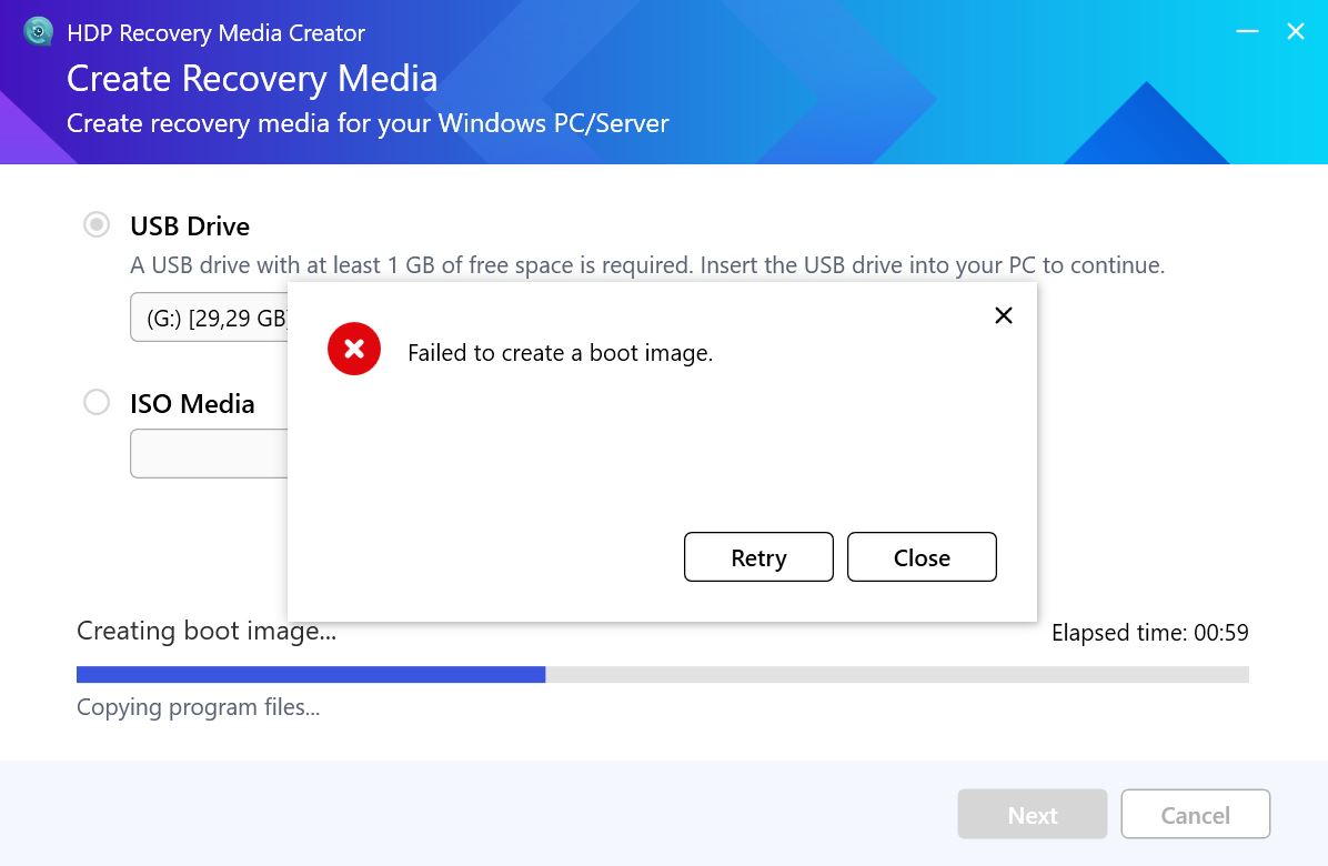 我正在嘗試製作可開機的 USB,但只收到一條訊息顯示:「failed to create a boot image」(無法建立開機映像)。
