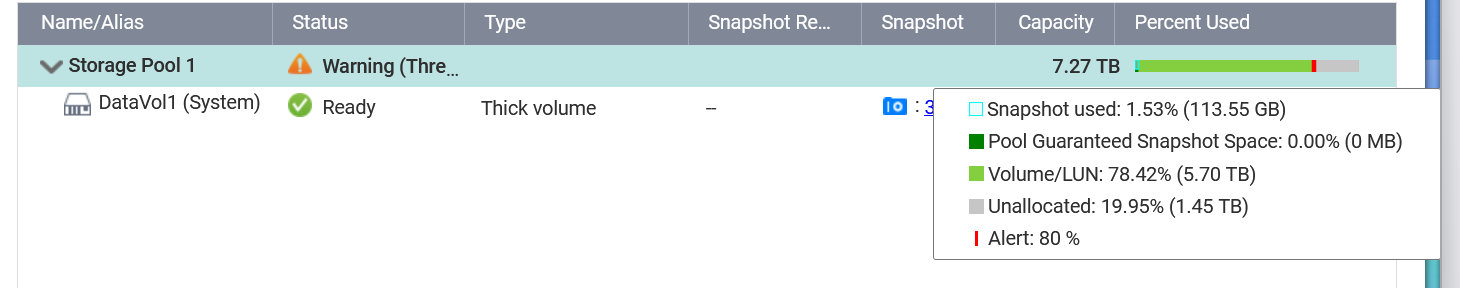 your Thick-volume use 78, 42 % and your snapshot use 1,53% → pool is over 80% (80,05%)
