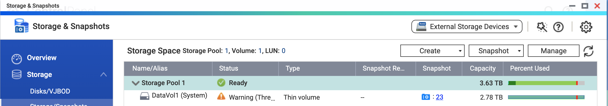 I’m lost. See screenshots. T-262 originally with 2 bays of 4T each. I ran out of room and did a replace one drive at a time with (2) 8T ea. I still get the same out of storage warning from the old disk. I’m just not seeing how to make use of what is now almost double the space.