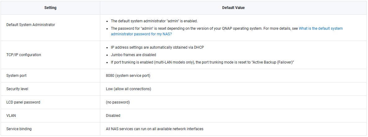 - 管理員密碼會恢復為預設值,依你的 QNAP 作業系統版本(QTS 或 QuTS hero)而定。