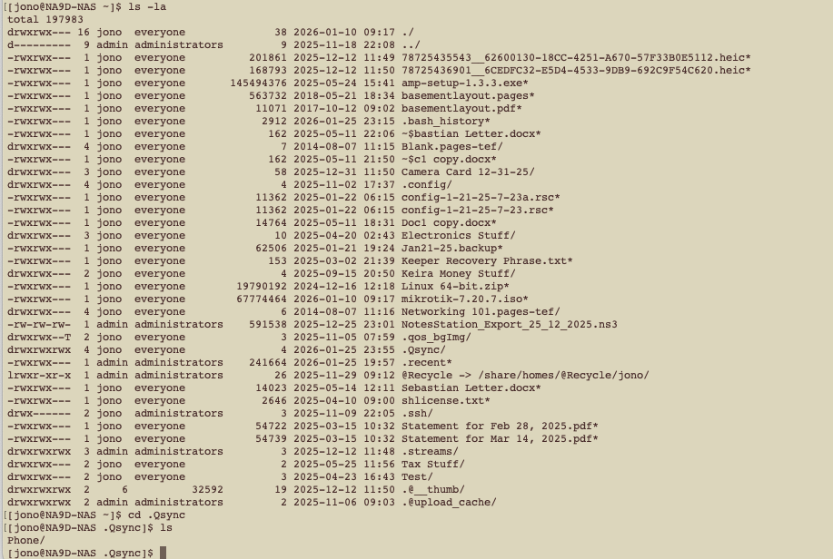 當你使用「預設」的 Qsync 位置時,QNAP 會將檔案儲存在你家目錄下名為 .Qsync 的資料夾中。如果你透過 SSH 連進你的 NAS,並在家目錄下執行 ls -la,你會找到它: