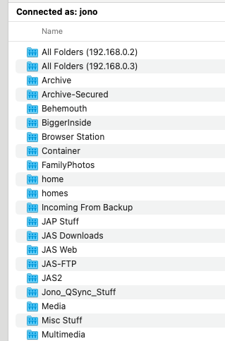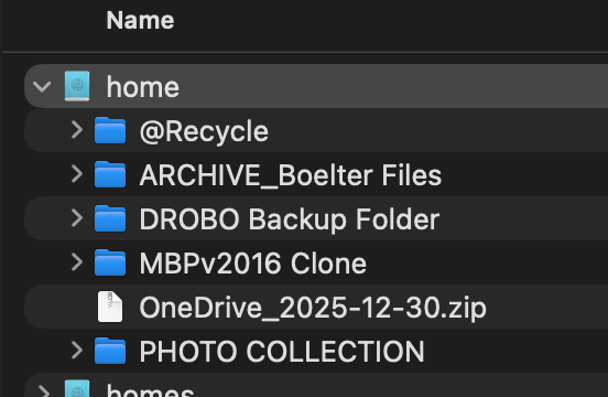 我在 Mac Finder 上 QNAP 的磁碟區——照理說,我的 QSync 資料夾應該要在這裡。現在,我能做的是在 FileStation 裡將同步涉及的主資料夾,利用「移動-複製」功能複製到 Home 資料夾中的「Archive」資料夾。這樣我就能在 Finder 裡存取這些檔案,但這樣很亂,因為我猜這個資料夾現在已經不在同步流程裡了。