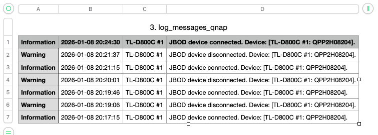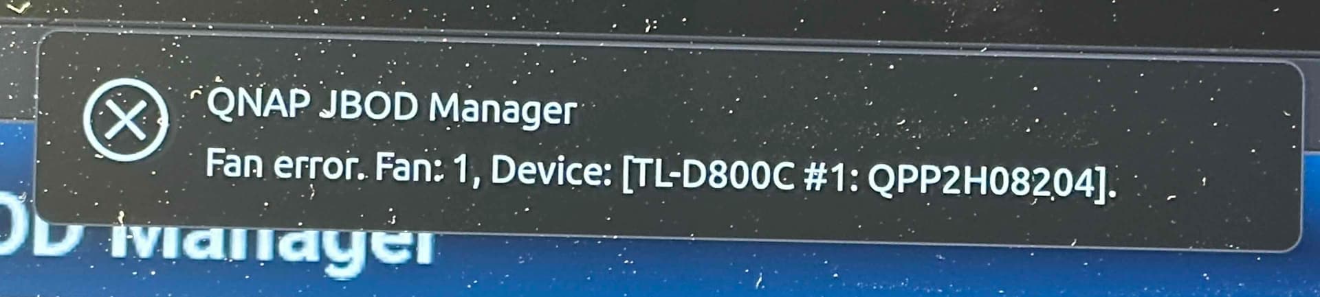 All USBs on the laptop are version 3.0 and higher. While trying different configurations I saw the notification “QNAP JBOD Manager Fan Error. Fan 1, Device: [TL-D800C #1: QPP2H08204]”:
