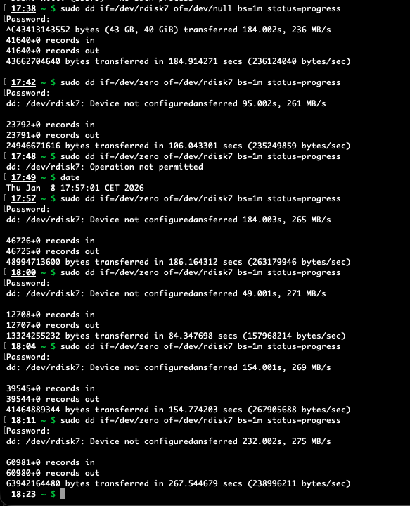 I have just received my TL-D800C and installed one Seagate Exos ST28000NM000Cdrive in bay 1 and connected it via USB cable directly to one of the USB3 ports of MacBookPro M1 2020 with MacOS Tahoe 26.2. Trying to fill the disk with zeroes, after maximum a minute copying I get this error:
