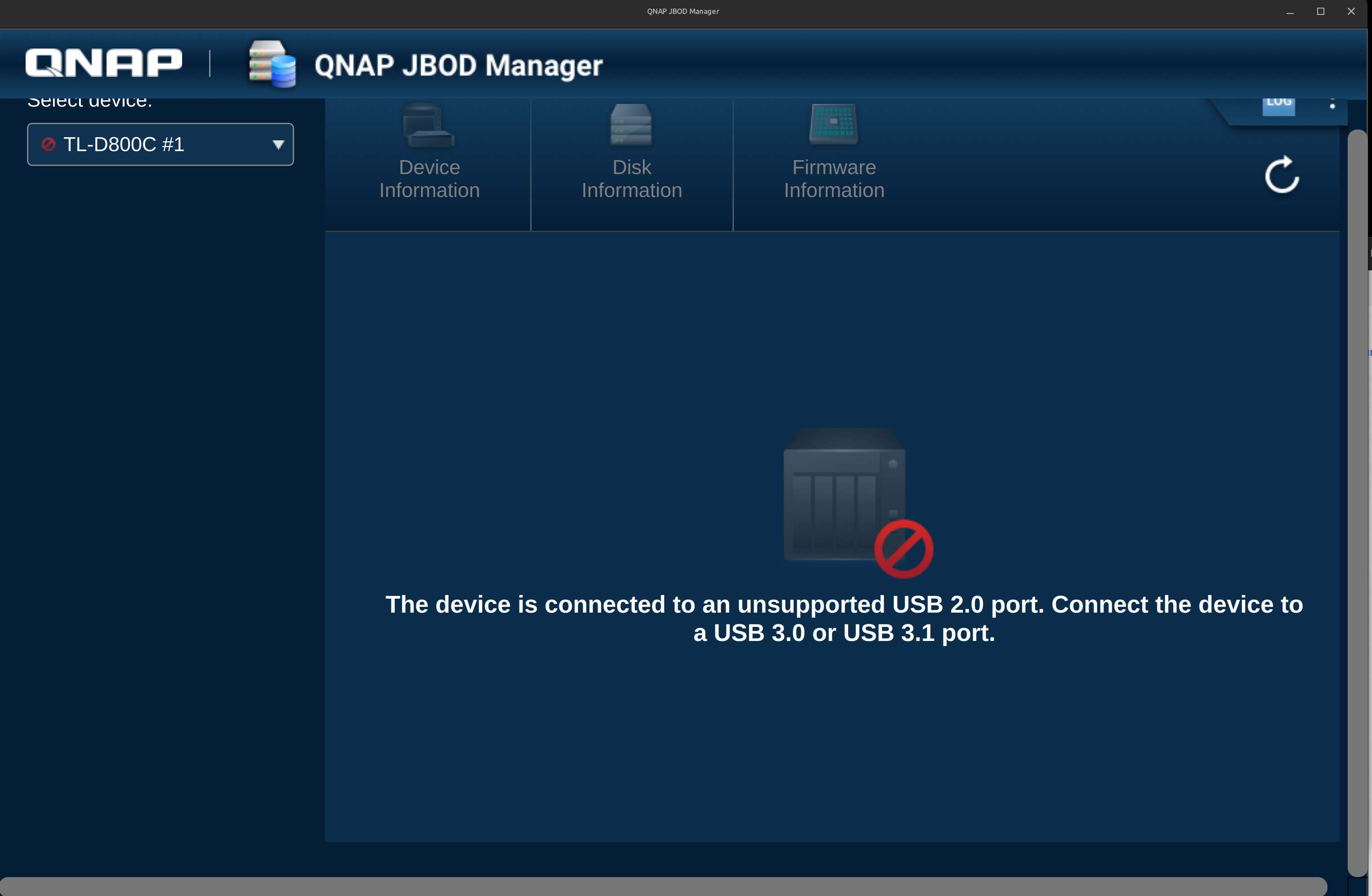 On the other hand UI on the “QNAP JBOD Manager” says “The device is connected to an unsupported USB 2.0 port. Connect the device. to a USB 3.0 ot USB 3.1 ports”