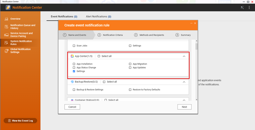 Check the event categories (Category) for which they want to receive notifications, allowing them to control which categories of events will trigger notifications.