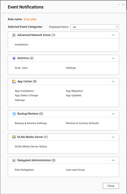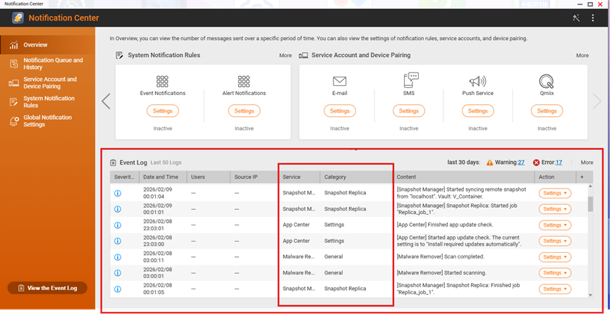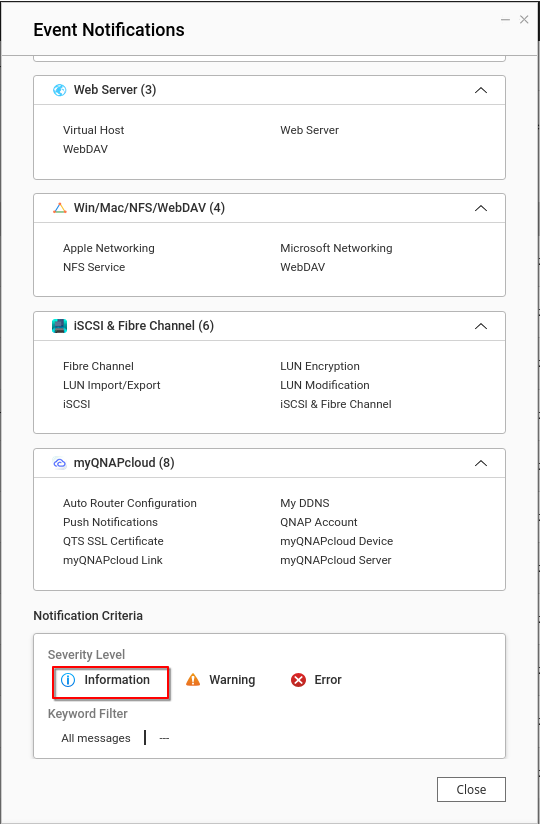 In the Notification Center events rules I set for all of them only the Warning and Errors severity, but nevertheless for some of them (QuFirewall, AppCenter, Malware Remover, Antivirus) I receive also all the Info messages, which are a lot, and completely useless.