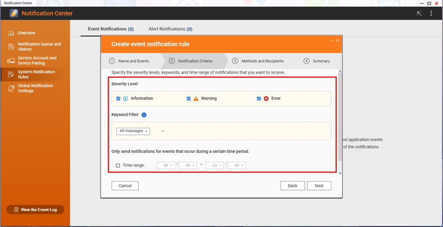 Further filter the selected events using criteria such as “Notification Severity,” “Keyword,” and “Time Range” to determine whether notifications should be sent.