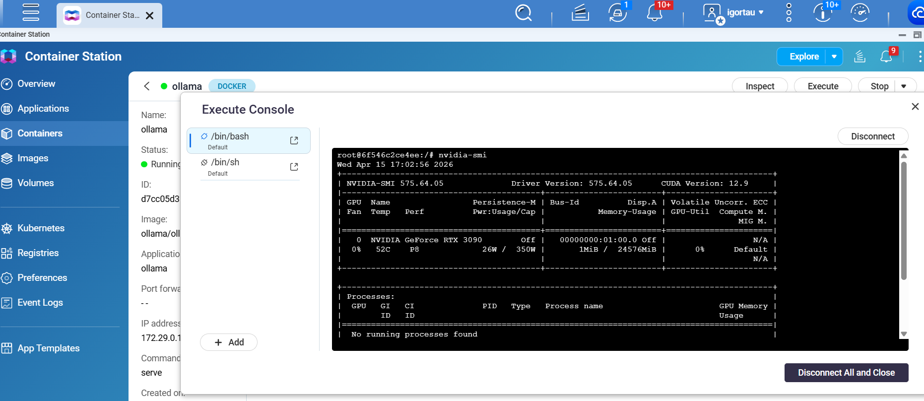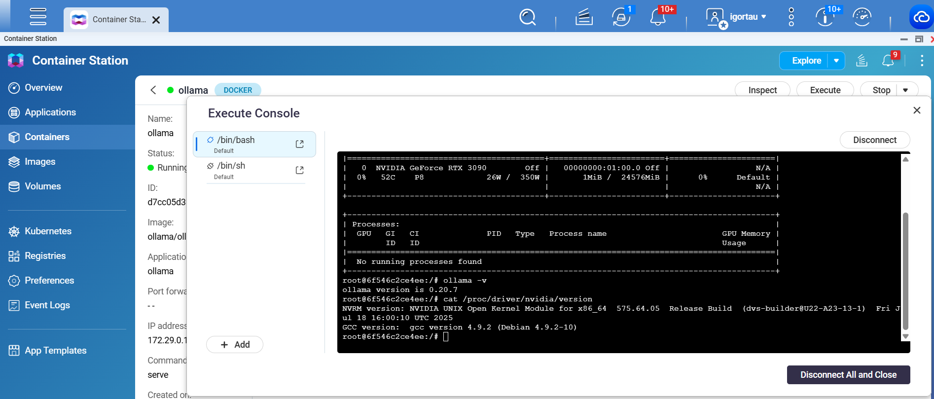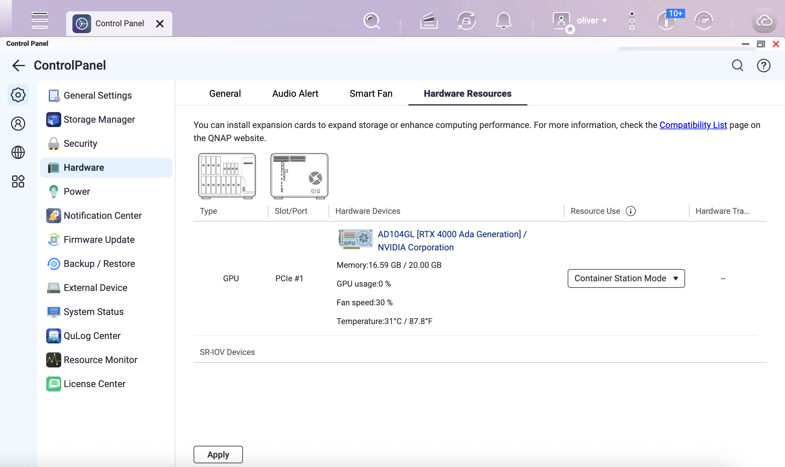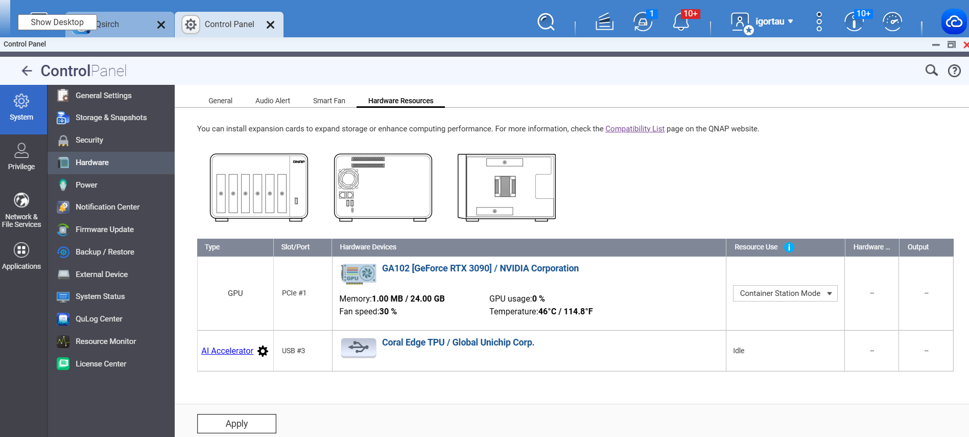 對我來說,看起來當我重啟後,ollama + GPU 可以正常使用。但經過一段 GPU 空閒時間後,GPU 在 ollama 裡就無法回應了。有趣的是,這時 GPU 在 QTS 裡變得可見,而且 emby(.qpkg 版本,不是 Container 版本)也能使用它。儘管 GPU 是專門分配給 Container 而不是 QTS 的。