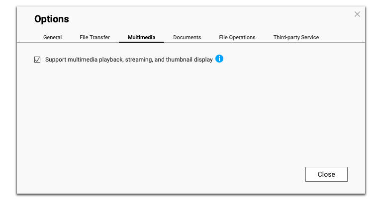 Untuk memutar file media di File Station, klik tiga titik di kanan atas jendela file station dan pilih pengaturan. Pergi ke tab Multimedia dan centang kotak untuk mendukung pemutaran multimedia.