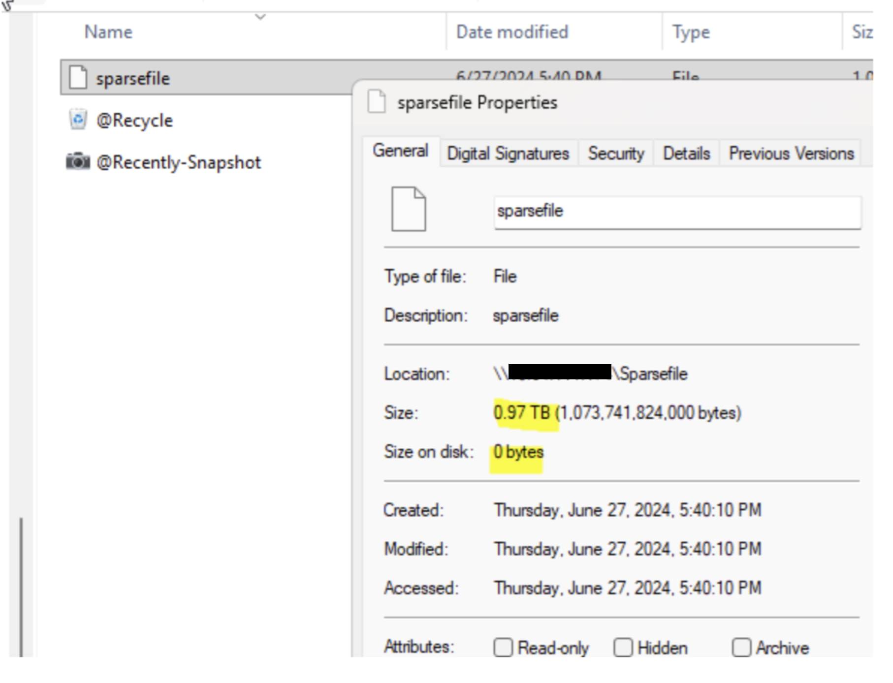 Windows File Properties shows both Size (logical size) and Size on disk (allocated size). For sparse files, a large “Size” with near-zero “Size on disk” is expected behavior.
