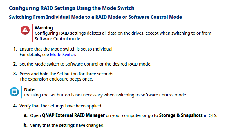 So I have all the drives configured to NTFS. But I want to set up the TR-004 as a lone unit. Can I use software control to set it up, then reboot and use the Hardware Dip switches?.