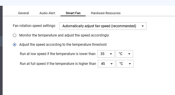 1.) Go into Control Panel - Hardware and select the Smart Fan tab. Change the fan speed from automatic setting to manual: