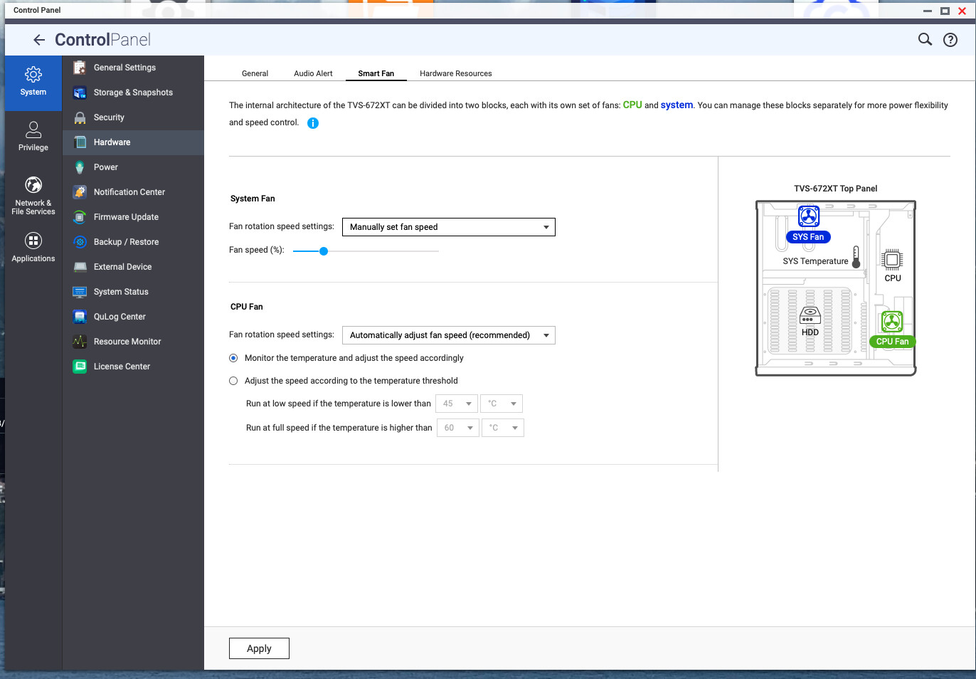 You can do the same for the CPU fan as well. This is on my TVS-672XT, so your system will have different settings or diagram but it should all be there.