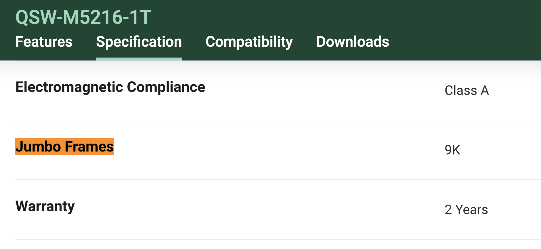 Auf der Webseite des QSW-M5216-1T ist klar aufgeführt, dass Jumbo Frame bis zu 9K unterstützt wird