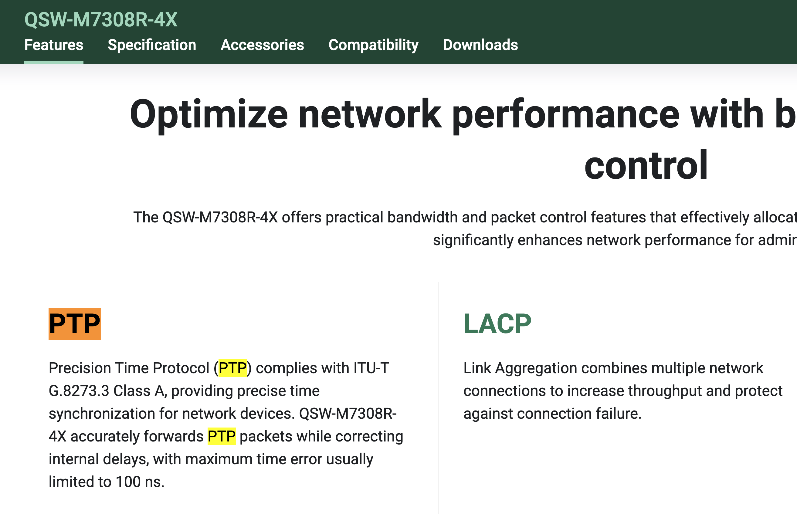 Beim Thema PTP (Precision Time Protocol) sieht es jedoch so aus, als ob keine Unterstützung vorhanden ist. Falls es unterstützt würde, wäre dies wie beim QSW-M7308R-4X auf der Webseite entsprechend gekennzeichnet.