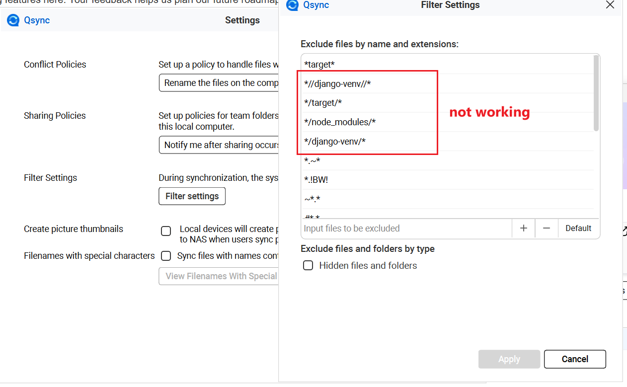 Currently, Qsync only supports file filters but not folder filters (including wildcard names). This causes issues during development, as large subfolders like “node_modules” are unnecessarily synced to the NAS. And selective sync need to change each time. Adding folder filter support is essential.