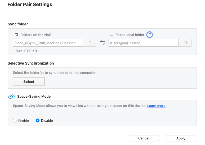 3.) If you want to keep files on your local machine, make sure you disable space saving mode. Otherwise, what it will do is copy all your files down to the NAS and then it will delete them from your PC. You will then have what is basically a “link” on your PC to access the file and when you want to access it, it will pull it from the NAS. This is similar to what services like OneDrive offer. You can set this on a per folder pair basis on each machine. For my laptop, I don’t use space saving mode as I want access to all my files if I am not connected online. But on my Mac Mini which always sits on my LAN and doesn’t move, I have space saving turned on.