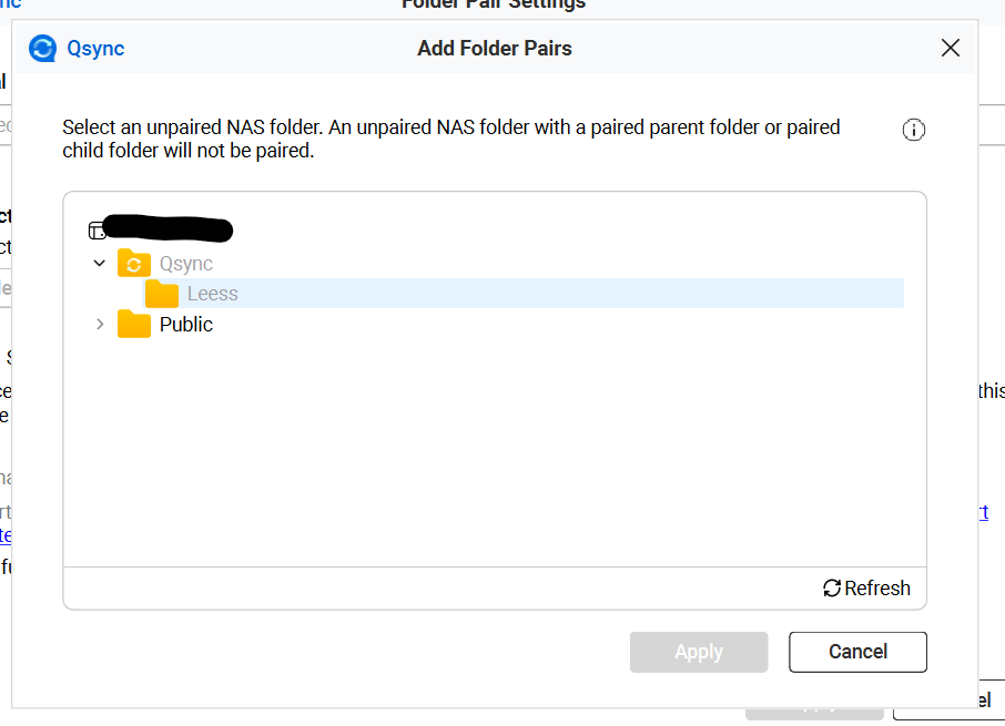期待しているのは、/home配下の他のサブフォルダ(例:/home/documents、/home/music、/home/pictures 等)もペアリングできることですが(フルパスは /homes/user/documents 等)、それができません。サブフォルダを同期ペアとして選択することができず、/qsyncフォルダやqsync centralで有効化されている他のフォルダしか表示されません。