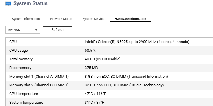 I had two 32GB CompuRAM modules, supposedly compatible with QNAP. However, I later read that many people had problems with that much memory, and QNAP immediately demanded a return to the standard 8 GB at the first sign of any issue. This happened to me as well. And I checked the kernel logs; there really were memory problems, indeed.