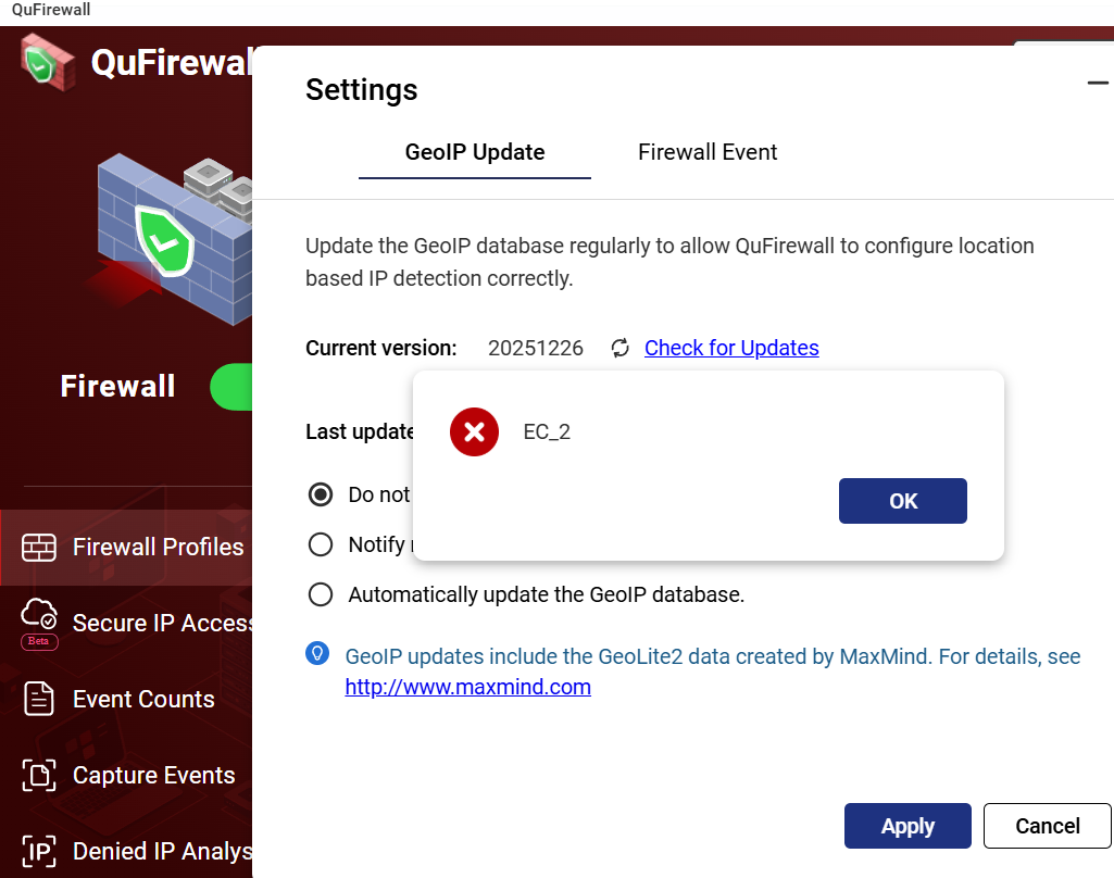 As the title says, I’ve been unable to update QuFirewall for a while and keep getting the error EC_2, any ideas? Thanks