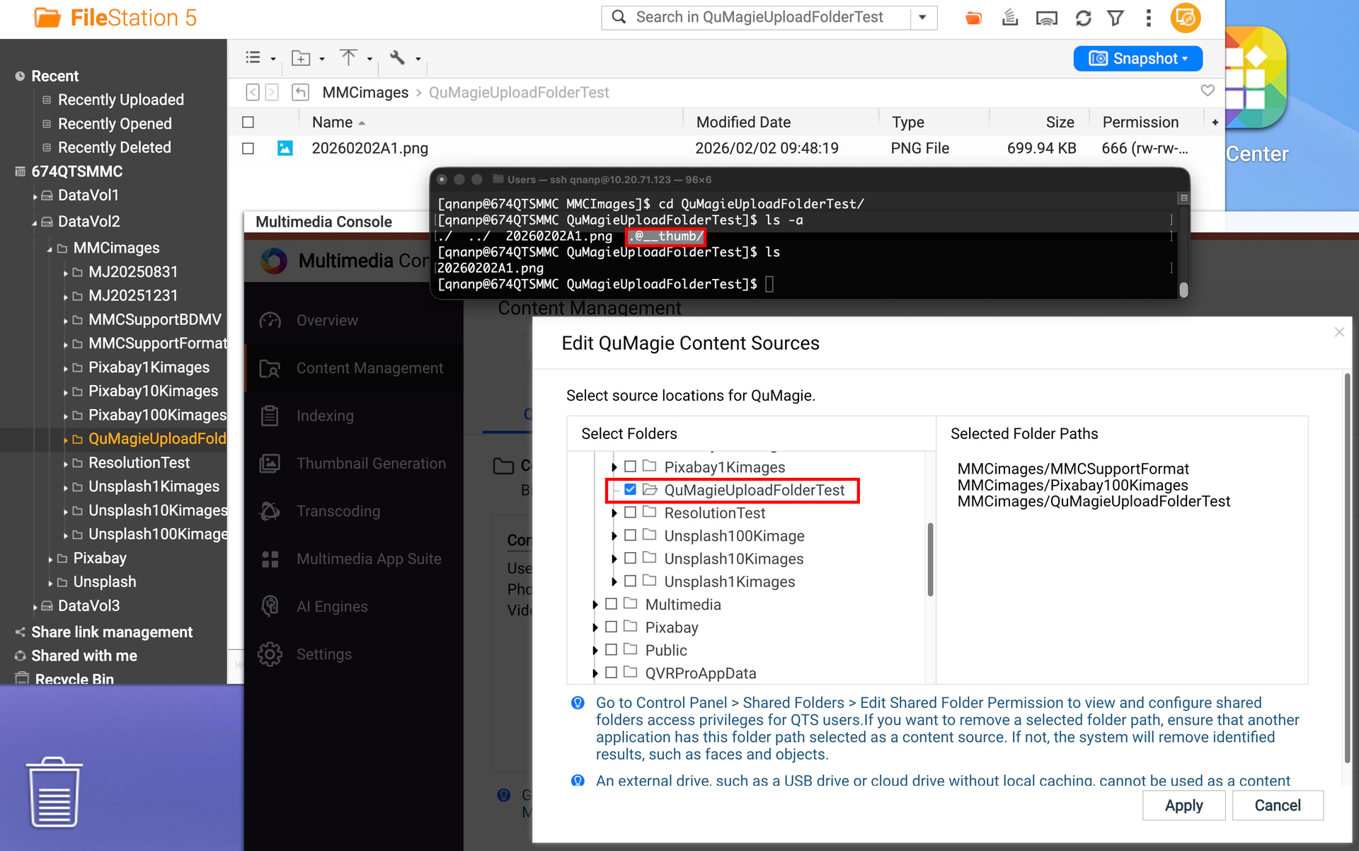 Has anyone faced a similar issue where the @__thumb directory becomes visible in QuMagie? Is there a way to force the Multimedia Console to ignore these system patterns?