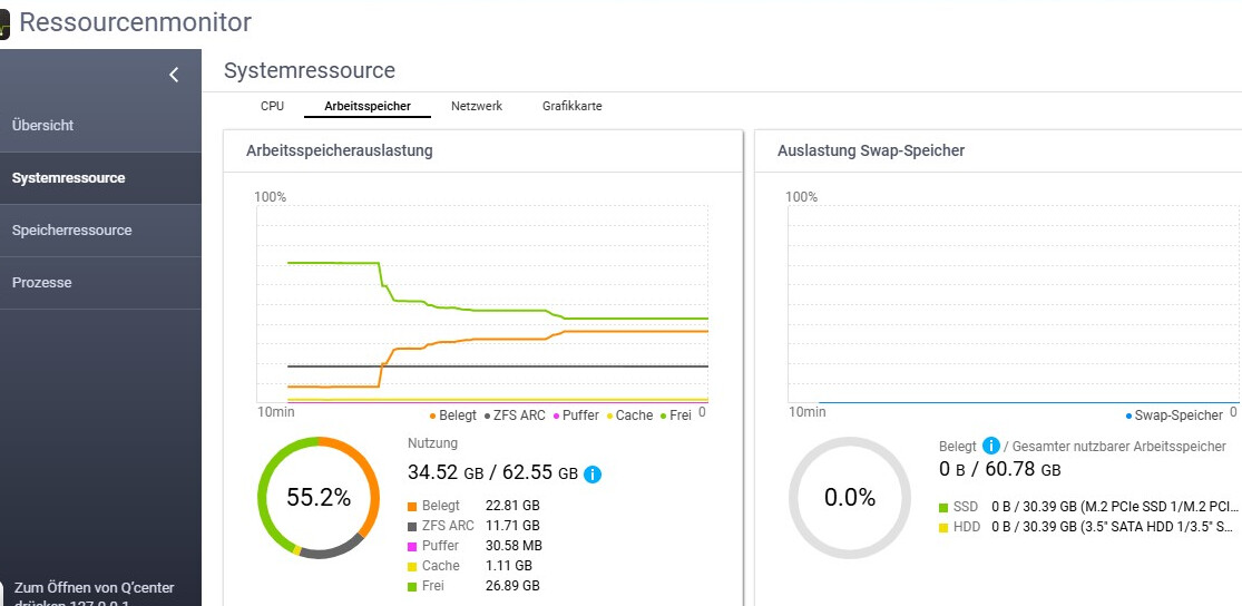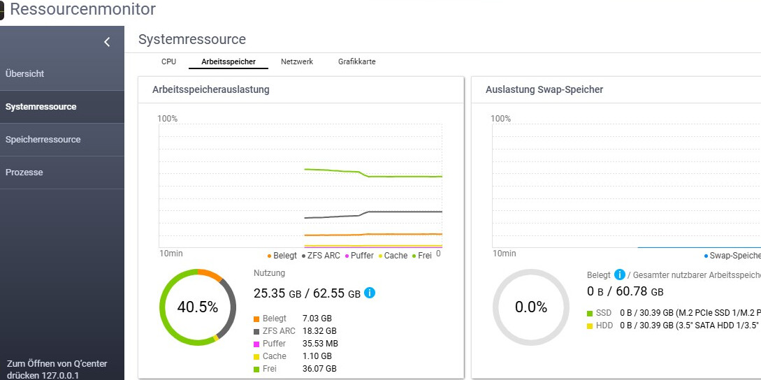 The resource monitor only shows the usage of arc_min as ZFS-ARC. That’s why the maximum is reached at 11.71 GB.