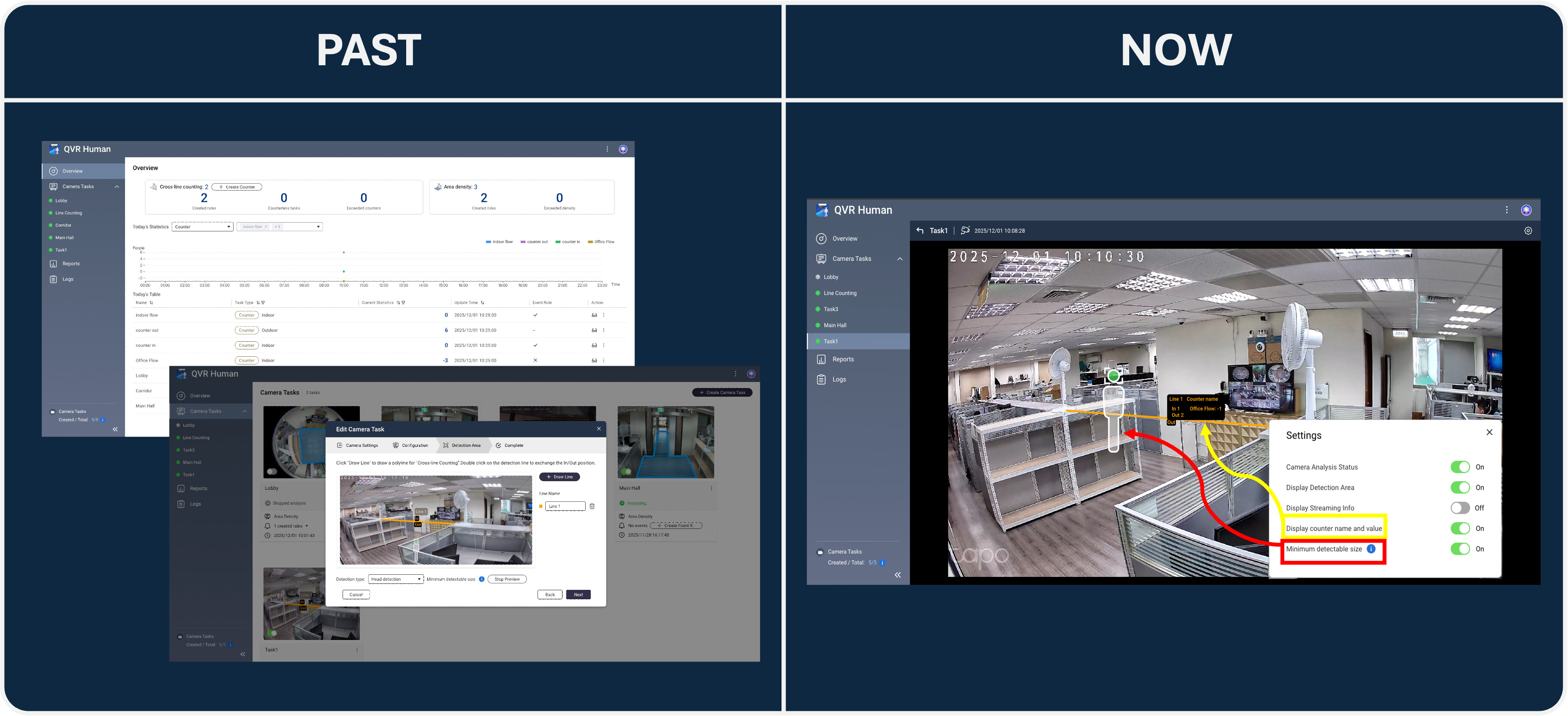 - Instant access to key metrics: Line-crossing details and minimum detectable size—previously hidden behind tabs—are now visible directly on the live stream, with customizable display options.