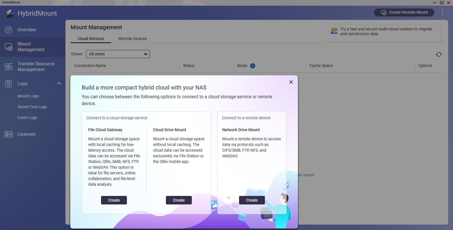 我用的是 Cloud Drive Mount(雲端硬碟掛載)。這個功能基本上會把雲端儲存像外接硬碟一樣掛載在 NAS 上,你可以在檔案總管裡存取。速度沒那麼快,但也不會佔用 NAS 的空間。