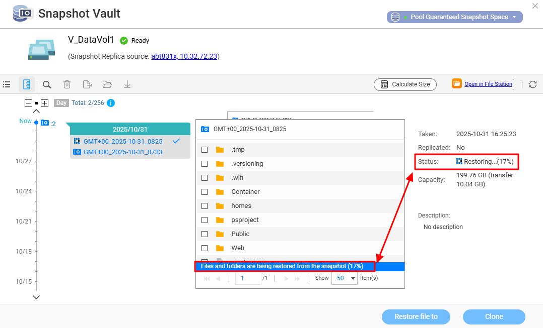So I’m restoring a bunch of folders that from snapshots that were vaulted to my second NAS. I have created a folder on the first (and now empty) NAS for restoring these. I have an NFS share set up and all works great. The folders are restoring from their snapshots. But NOTHING anywhere shows the progress of the restore. I mean nothing. It is not showing on either machine. It doesn’t show in background tasks, snapshots or anywhere.