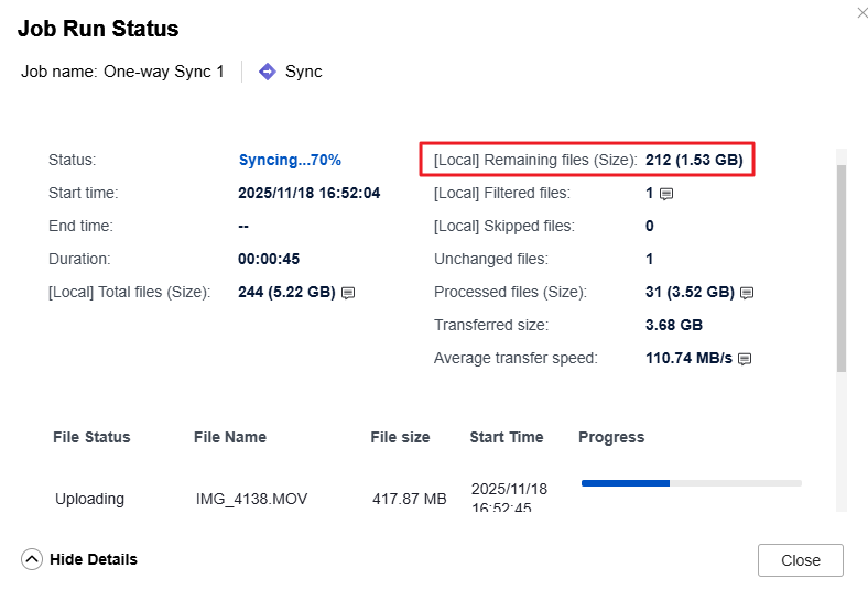 Yes, you are right. I don’t see remaining files field after changing my sync job to real-time sync.