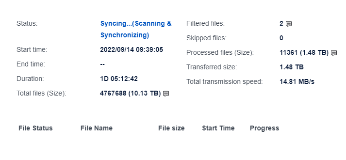 Greetings. I have 2 NAS, one normal one hero OS. I did initial rtrr sync in local lan, and then removed the non hero nas to offsite location. I have everything working, they talk via internet on rtrr, and i just started new rtrr job, and I am expecting it to just sync changed new files etc. So is there a way to actually know how many files is in the queue that need to be copied? I cannot find that information nowhere. It just says how many files it did transfer, but the remaining files count is nowhere to be found. Thank you