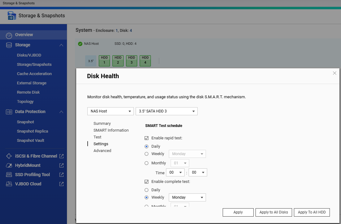 Between the built in functions of the drive and the RAID monitoring of the NAS, you likely don’t need to run the tests too often, but it is really a personal user choice.