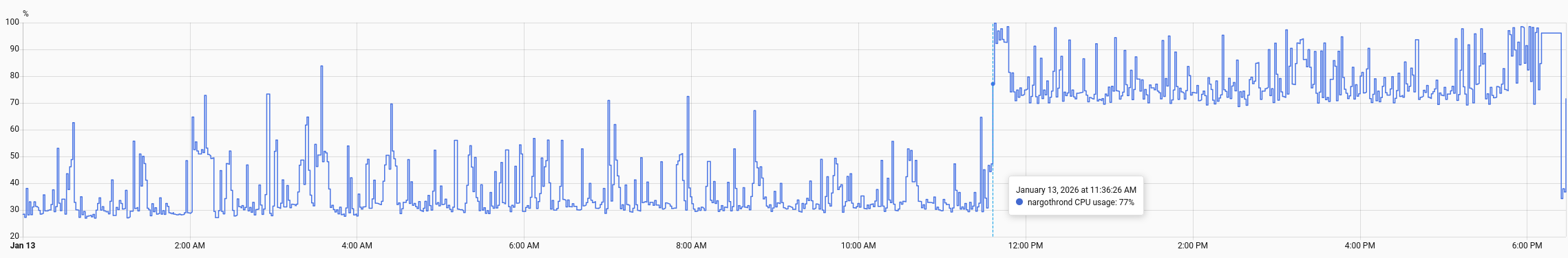 Another strange thing happened tonight, when the load dropped from ~30-60% after the reboot to 5-30%, with no event in the notification center at that time.