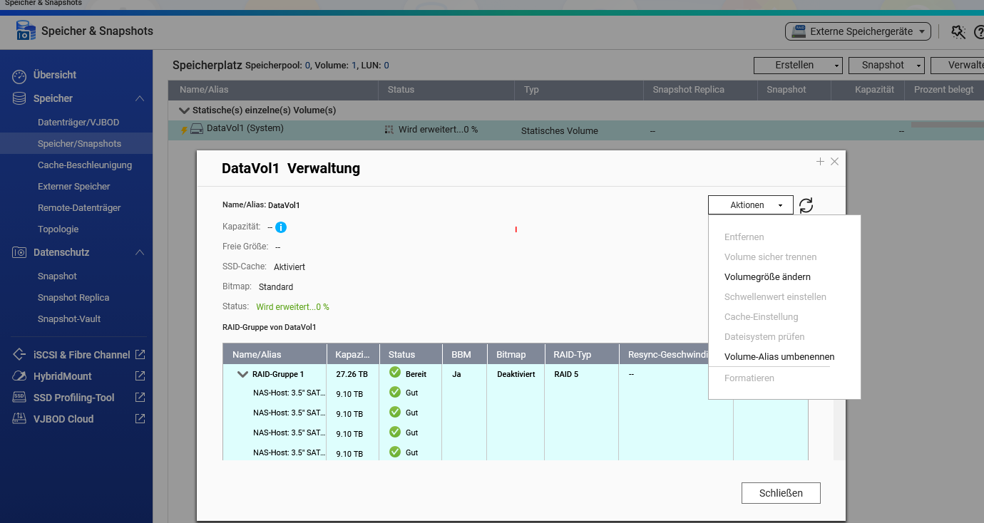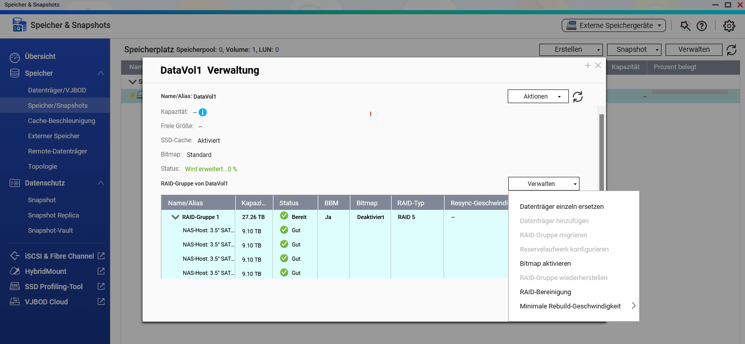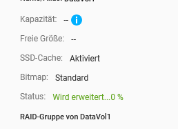 Eigentlich ist es komplizierter : Platten (4 10GB Seagate) waren ausgebaut. Beim Wiedereinbau wahrscheinlich nicht in richtiger Reihenfolge eingebaut. Gerät erkennt eine, die zum Raid 5 zugefügt werden muss. Lief alles scheinbar normal. Speicherplatz wurde erweitert…JETZT LÄUFT NOCHMAL “WIRD ERWEITERT 0%”.