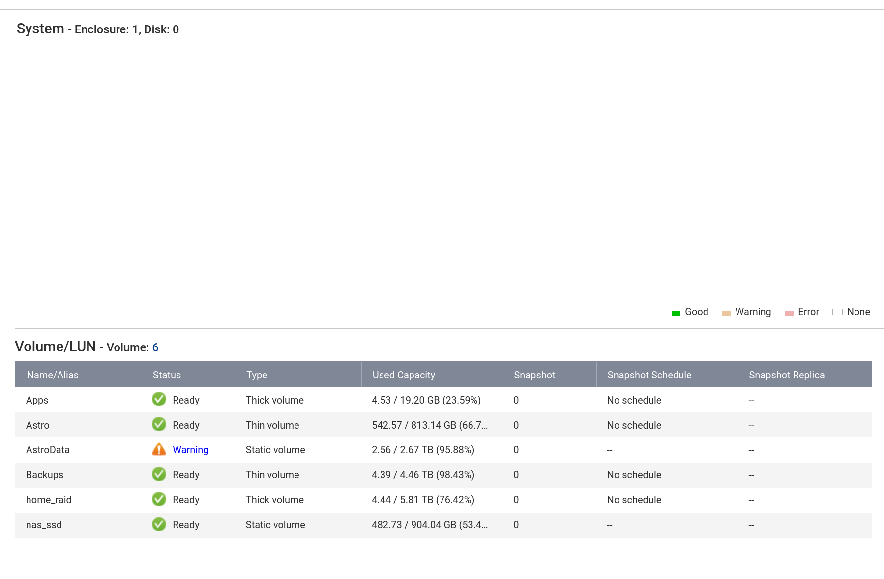 I have noticed that most probably after the last update to my TS-531P Storage and Snapshots show 0 drives. I tried to reboot, power down etc. and nothing helps, I see all volumes, the NAS apart from that functions properly, there are no error in the logs.