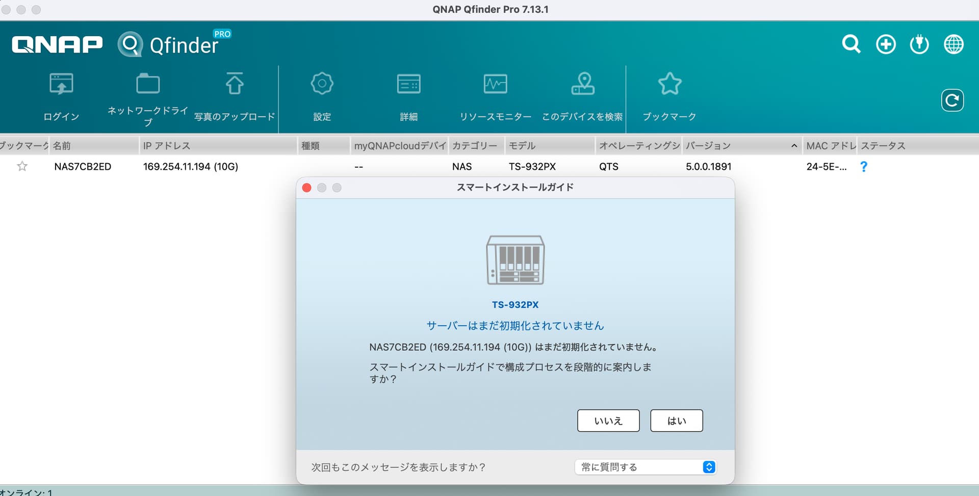 Saya mengalami gangguan listrik sesaat, dan tampaknya data bisa dibuang asalkan perangkat bisa digunakan kembali, jadi saya berniat untuk membangun ulang sistem. Namun, seperti yang terlihat pada lampiran, AQfinder mengenali perangkat, tetapi meskipun saya klik “Ya”, panduan instalasi tidak muncul…