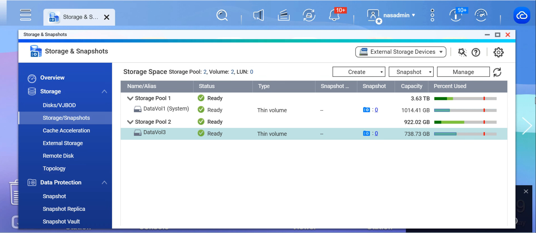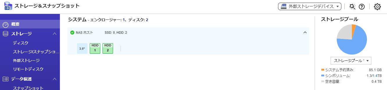 購入したてのころ、なんの知識もなく初期化して使っていたのですが、残容量がやたらと少ない(2TB)と思っていたところ、スナップショットがかなり容量を食っていました。